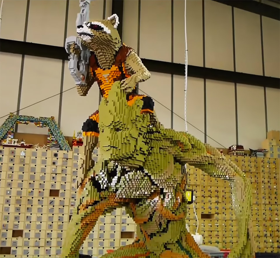 Bom, voltando ao post: A Marvel encomendou para a Premiere de Londres e para Comic-Con de San Diego a construção de uma estátua em tamanho real dos personagens Rocket e Groot. Só que montada com peças LEGO!