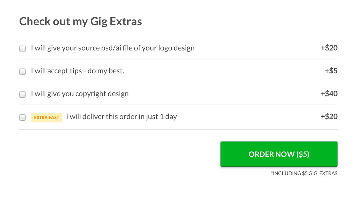 E, bem, chegando na hora do pagamento, uma surpresinha : além da taxa de US$ 5 pelo logo, você precisa pagar quantias maiores por serviços “extras“, como receber os arquivos das imagens originais (o que, convenhamos, é um requisito para quem deseja fazer uso do logo em qualquer coisa que seja).